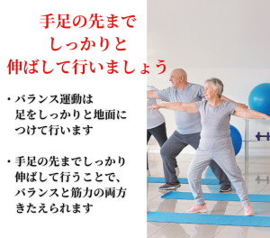 3.バランス運動: 転倒予防に役立ちます。簡単な立ち姿勢から始め、徐々に難易度を上げていきます。