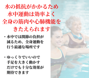 4.水中運動: 水の浮力を利用して関節にかかる負担を減らしながら、筋力を強化します。